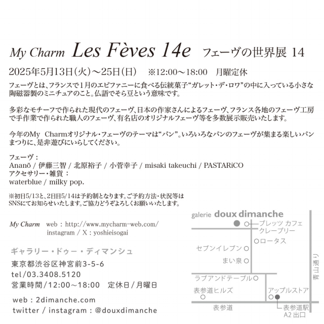 Les Fèves 14e 今年も My Charm さんが開催される 「フェーヴの世界展14」 2025.5/13(火) ~ 5/25(日) に参加させていただきます。 : 今年のテーマは「パンまつり!」 : 初日5/13(火)、2日目5/14(水)はご予約でのご案内になります。 詳細は ギャラリー・ドゥー・ディマンシュ さんにて どうぞ、よろしくお願いいたします。 2025-04-19